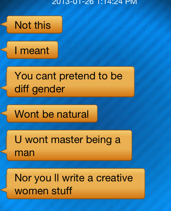 B) Thinks that, despite the fact that he can't consistently compose a sentence or a clear thought, he is any kind of authority on writing, or character work... With all due respect, Mister: Neither your approval, nor your ill-informed opinion, has any bearing on how I throw my pen about.